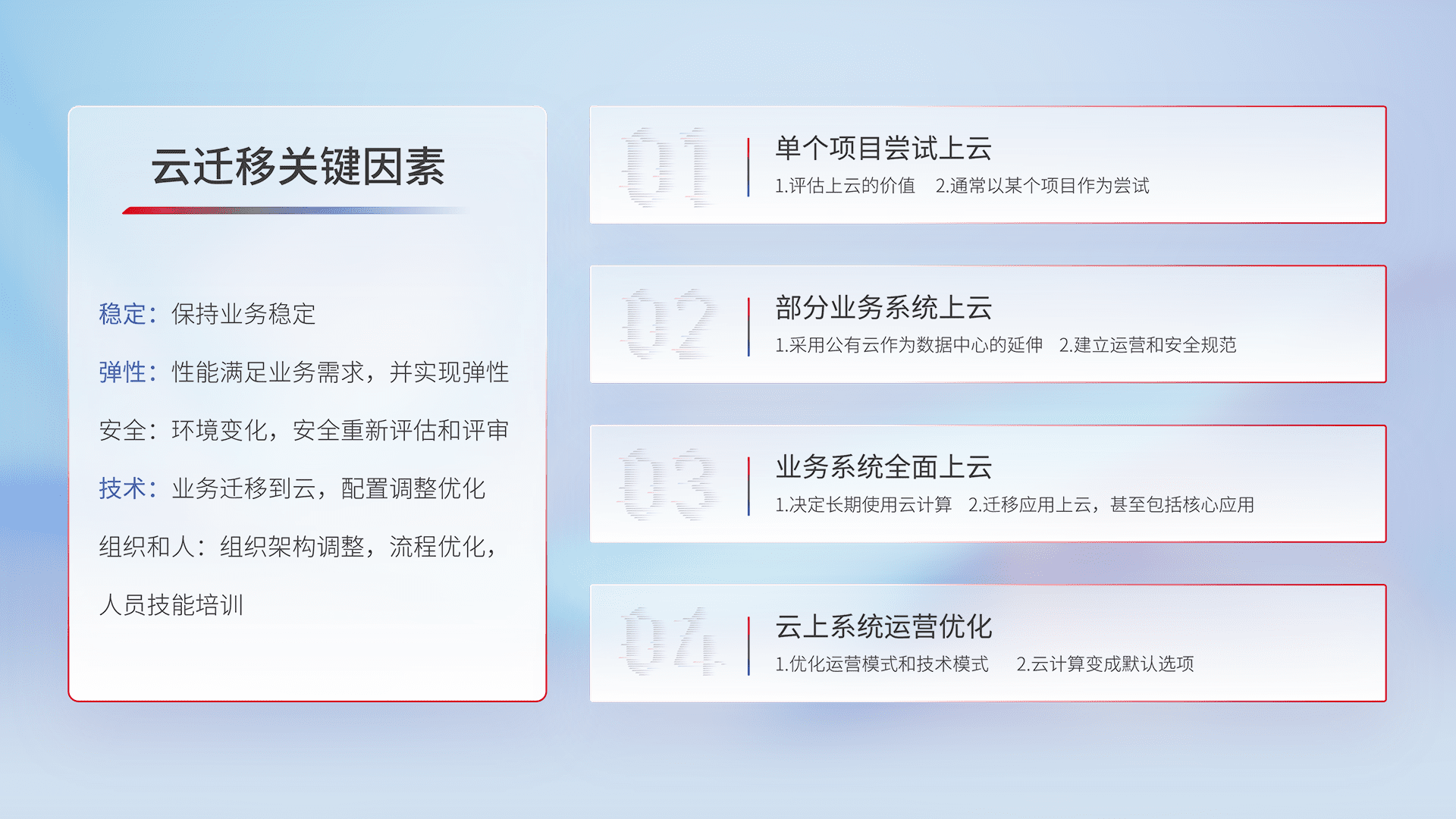 结合实际业务,,,,从规划设计、、、、云平台选型、、、云原生改造、、、、数据迁移、、集成交付,,,,迁移全过程为客户识别最佳上云路径,,做好风险识别管理,,设计网络架构、、、身份权限、、安全审计合规、、操作审计、、、日志审计、、、监控告警策略、、多站点容灾设计等,,,,对云上基础设施进行整体规划,,提升IT治理水平,,,以满足弹性、、高可用、、、高性能的需求。。。。