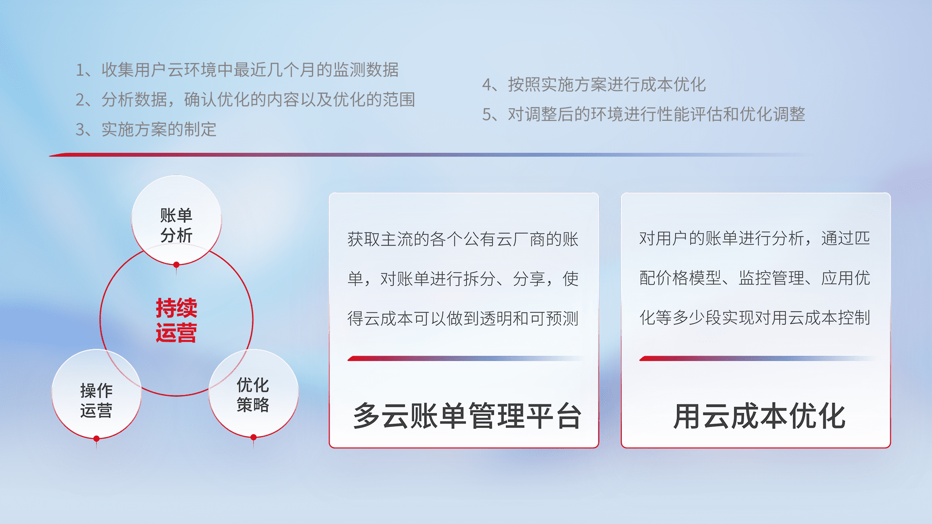 通过多云纳管,,,以统一的资源数据模型把客户的云资源进行抽象和封装,,,,进而实现对多云资源的统一操作,,保障云资源管理的可靠性、、稳定性与可用性。。。量身定制化运维内容,,,,配置、、、、开发运维、、、补丁管理、、、备份、、、、监控、、、、认证和访问管理、、审计和日常巡检等,,保障在用云过程中的可靠度,,,,稳定度以及高可用率。。。